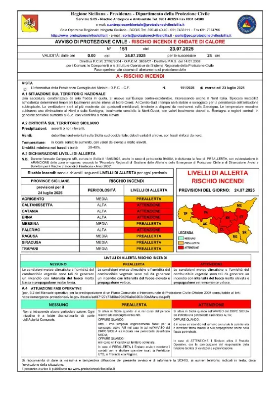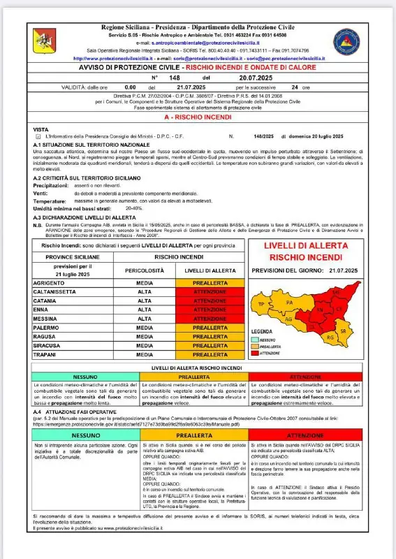 Comunicato protezione civile regionale.Avviso di protezione civile per rischio incendi e ondate di calore.Domaniโ giovedรฌ 26 luglio 2025โ รจ prevista una pericolositร MEDIA per rischio incendi in tutta la Sicilia. Bollino rosso per rischio Ondate di Calore a Messina e Catania.